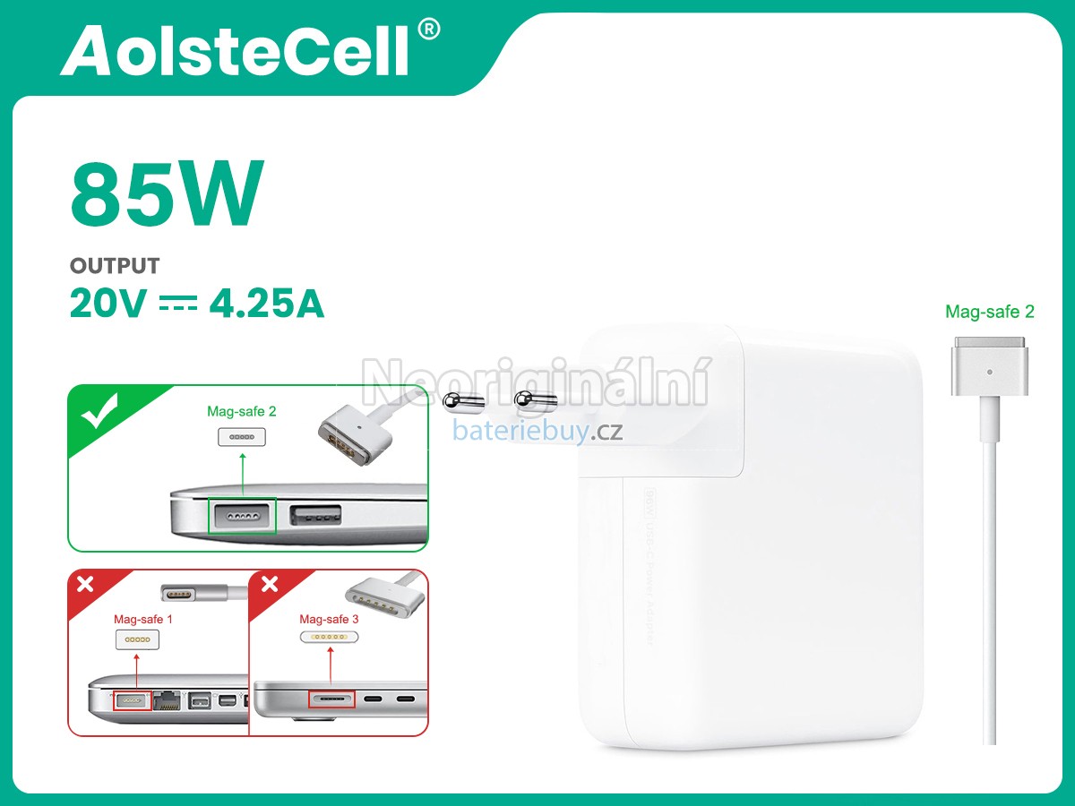 - Rychlé nabíjení: S pokročilou technologií nabíjení náš Apple 85W MagSafe 2 adaptér poskytuje rychlou a efektivní energii vašemu zařízení, což vám umožní zůstat produktivní bez dlouhých čekacích dob na nabíjení.