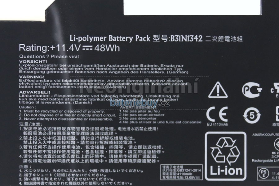 - Baterie pro notebooku Asus B31N1342(3ICP7/60/82) mají jednoroční záruku kvality a 30 denní záruku vrácení peněz. Určitě si ji kupte.